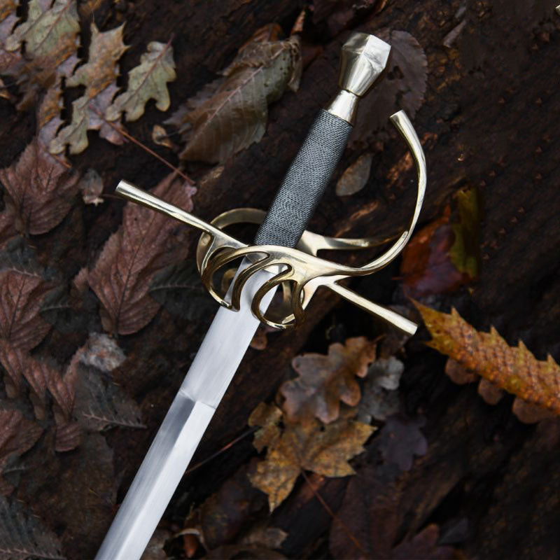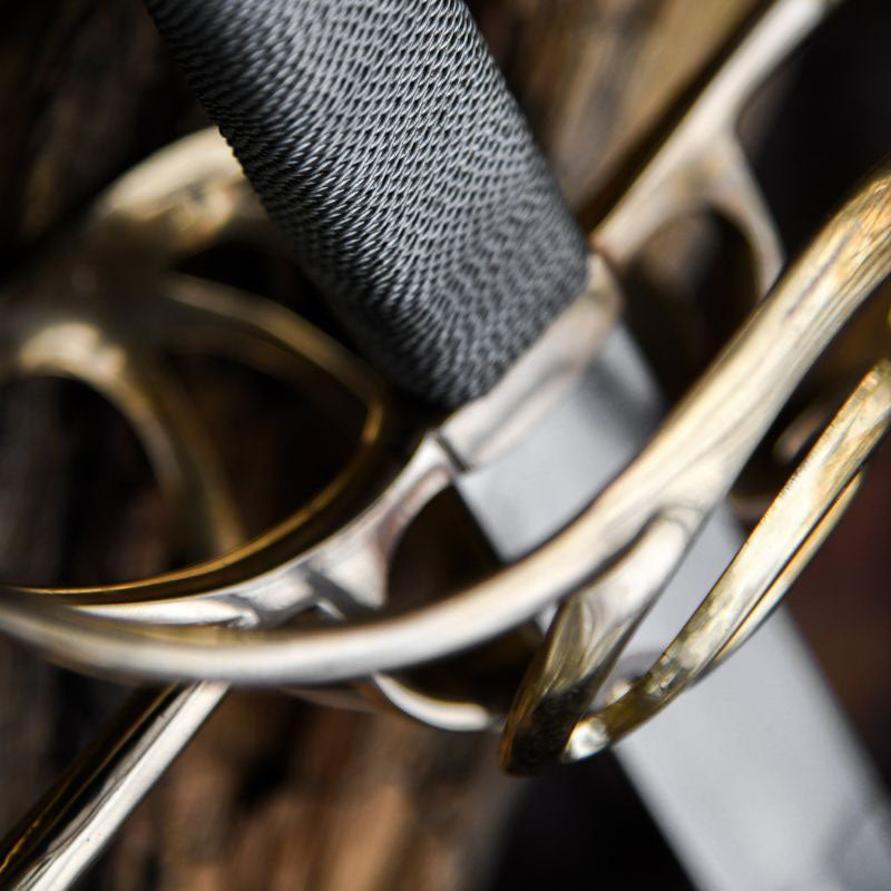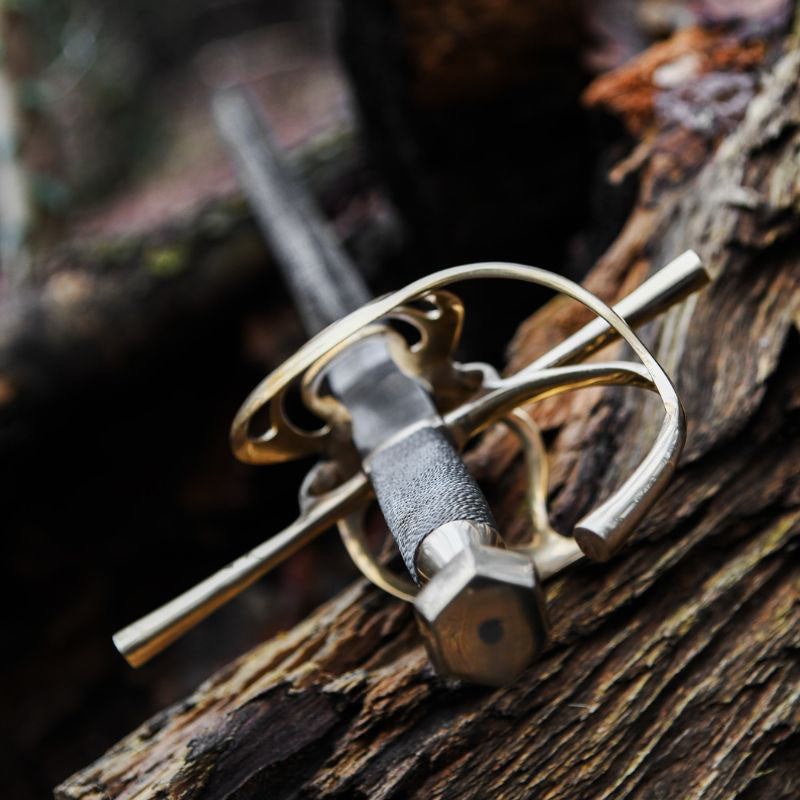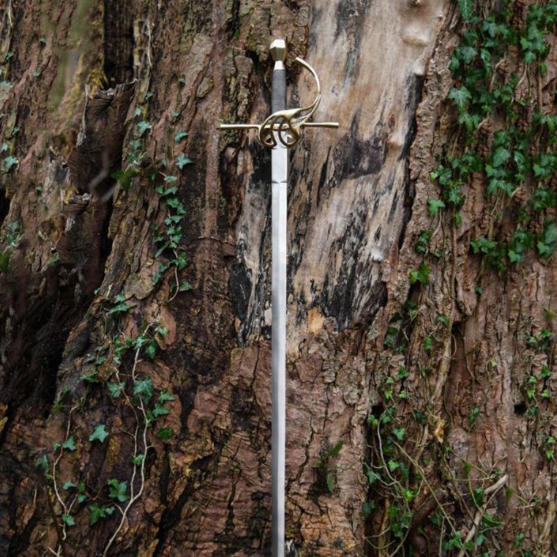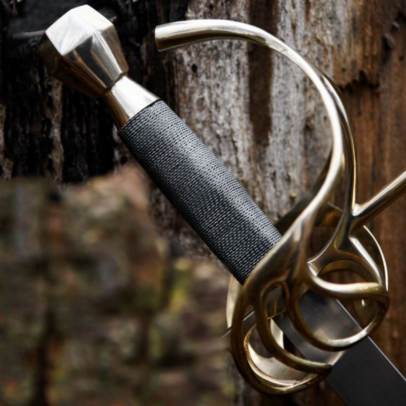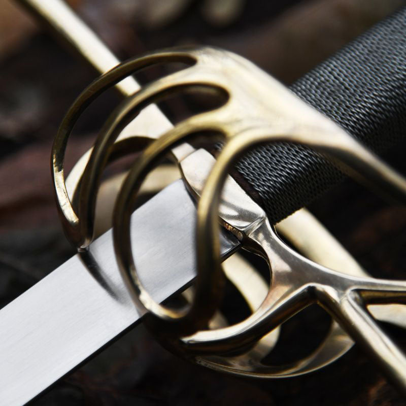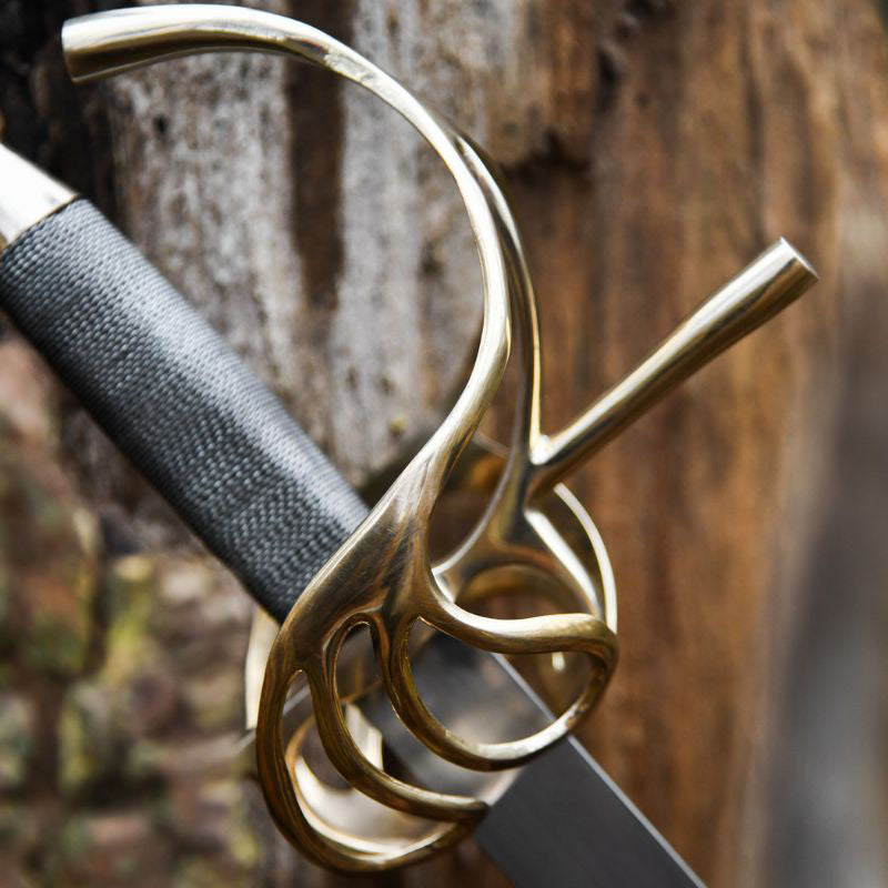 Une réplique d’après des modèles du 17e siècle. La lame est fabriquée en acier au carbone. Toute la partie de la poignée a été fabriquée en laiton. La lame est émoussée.